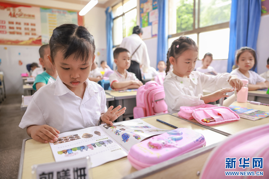 9月2日,云南省开远市东城小学,一年级新生翻开新课本阅读。新华网发(陶家淇 摄)