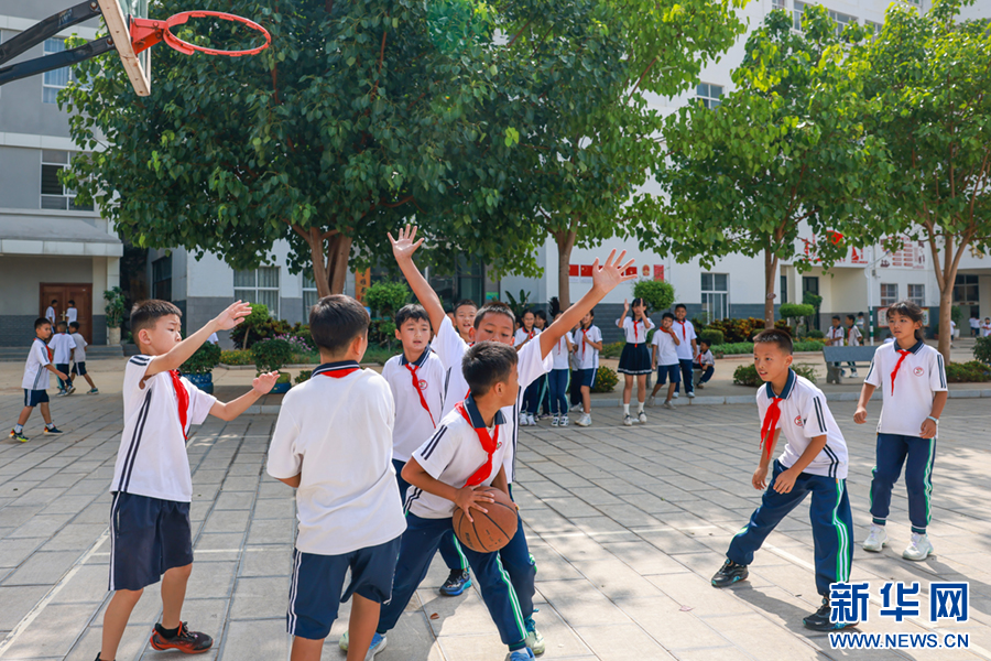 9月2日,云南省开远市东城小学大课间休息时,学生在球场打篮球。新华网发(陶家淇 摄)