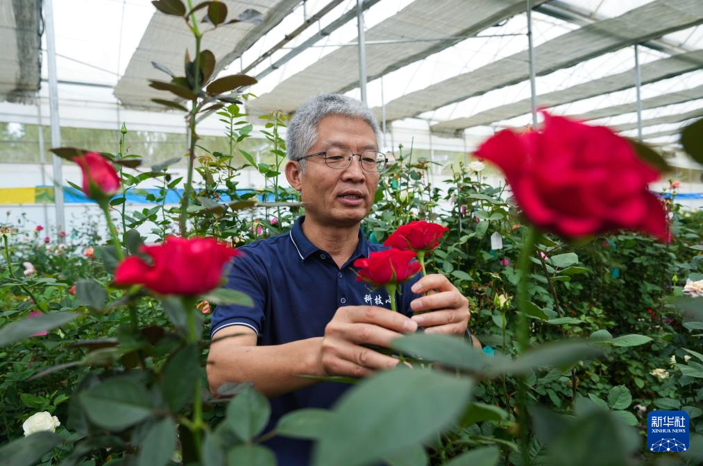 8月23日,中国农业大学教授、中农大-云天化花卉联合研究中心主任高俊平在云南晋宁花卉产业现代化示范园内查看月季新品种。新华社记者 陈欣波 摄
