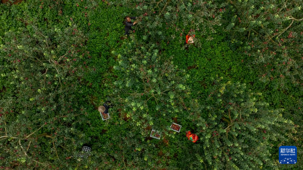9月3日,云南省红河州蒙自市西北勒乡的农户在采摘苹果(无人机照片)。新华社记者 胡超 摄