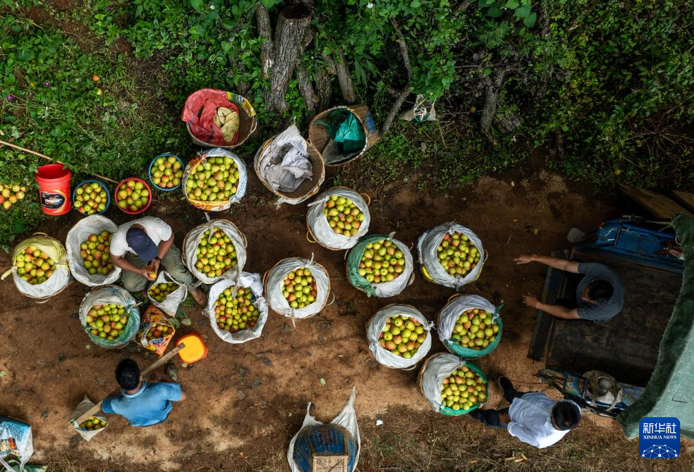 9月5日,红河州个旧市鸡街镇的果农在分拣鲁沙梨(无人机照片)。新华社记者 胡超 摄