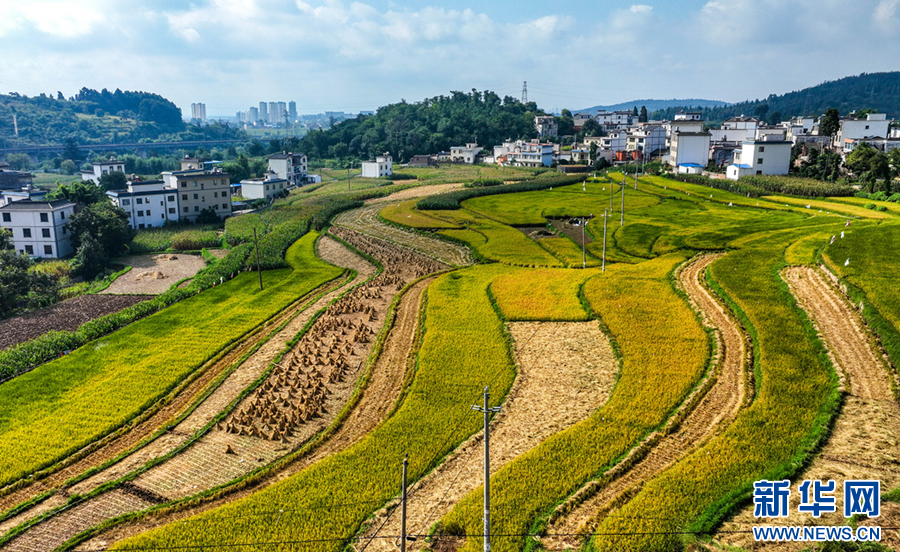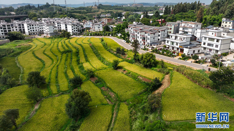 9月4日,云南省曲靖市沾益区天生坝村,梯田与村舍勾勒出一幅优美的田园丰收画卷。新华网发(孙文来 摄)