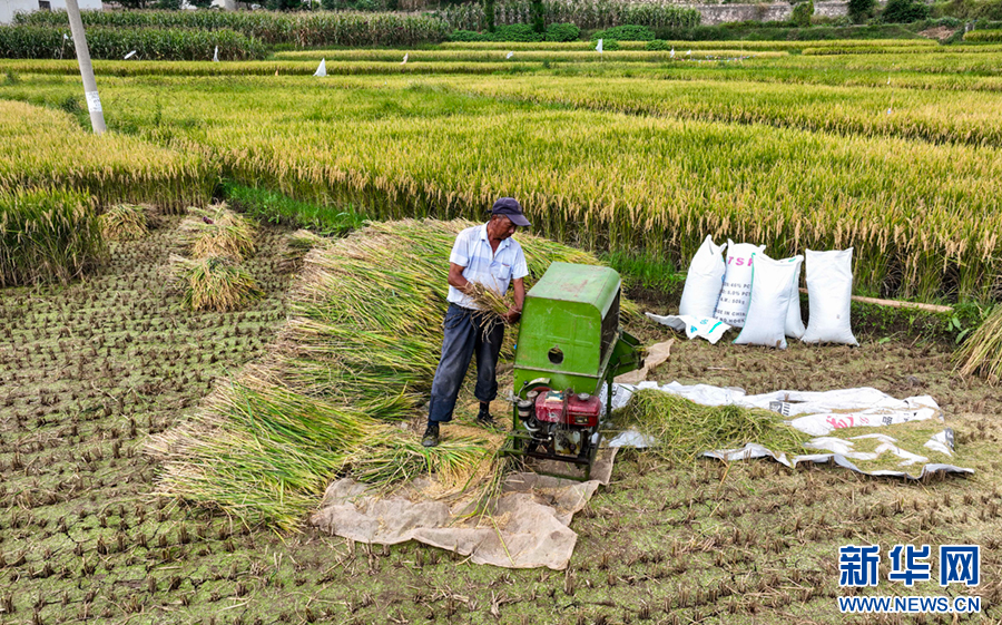 9月4日,云南省曲靖市沾益区天生坝村,村民忙着收割水稻。新华网发(孙文来 摄)