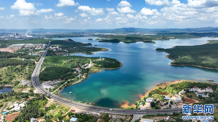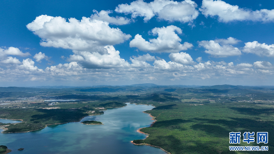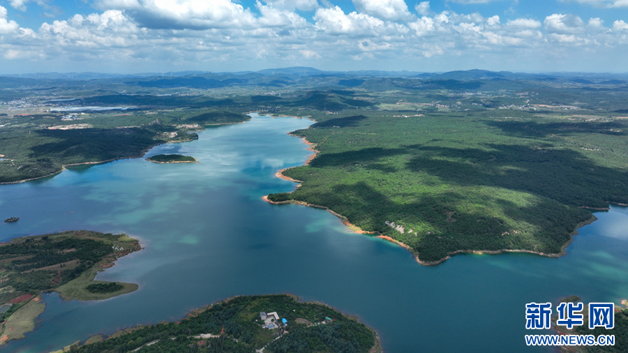 航拍云南曲靖花山水库,蓝天碧水宛如画卷(9月5日摄)。新华网发(孙文来 摄)