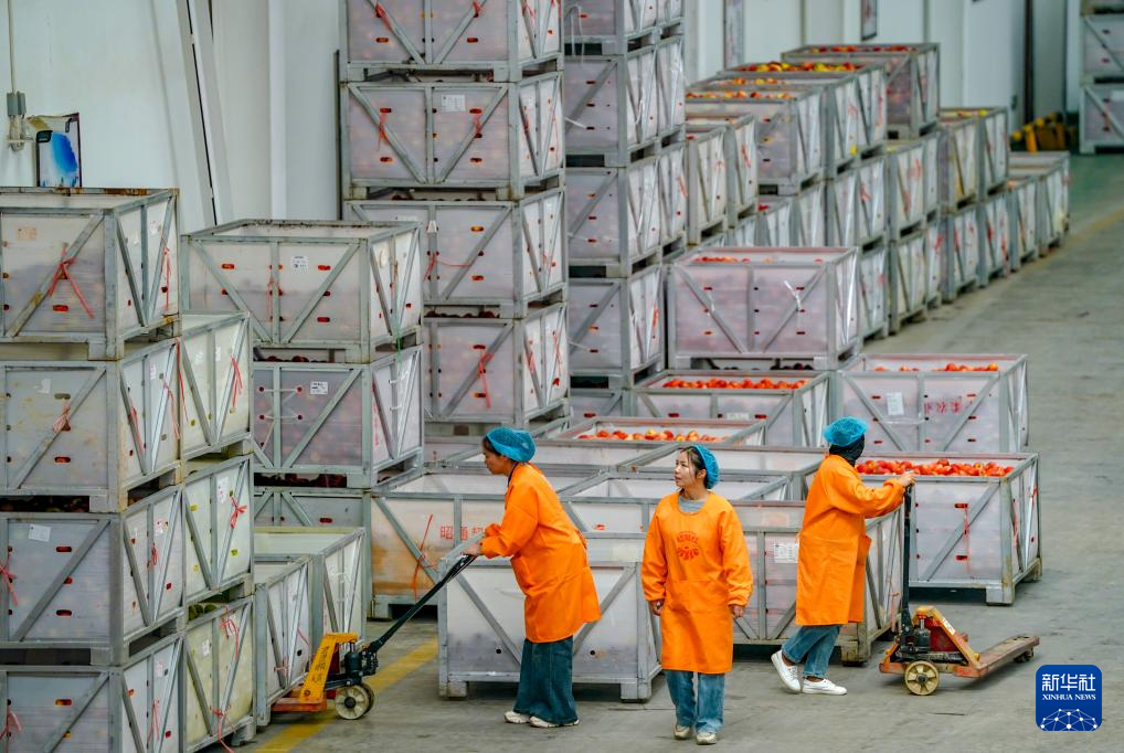 9月29日,工作人员在昭通市超越苹果基地苹果分选车间内运苹果。新华社记者 陈欣波 摄