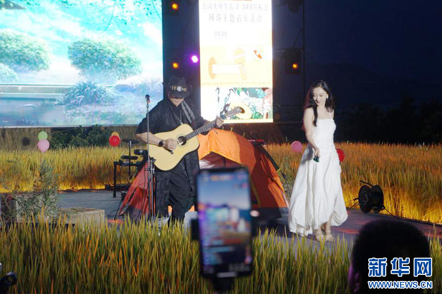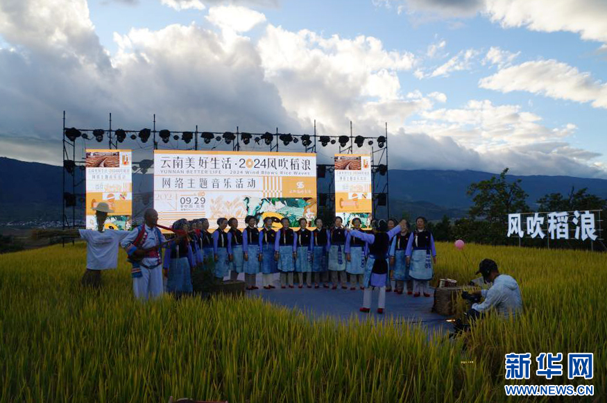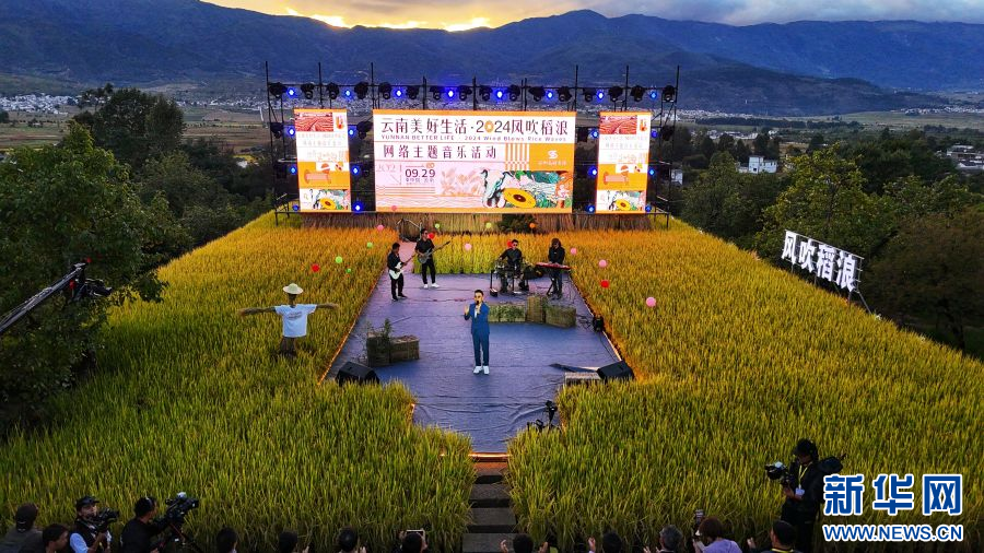 新华网昆明9月30日电(范芳钰)丰收时节,云南省大理白族自治州洱源县凤羽镇万亩稻田陆续迎来丰收。伴随着阵阵稻香,9月29日晚,一场美妙的音乐会在凤羽镇佛堂村空中稻田剧场上奏响,“云南美好生活·2024风吹稻浪”网络主题音乐活动就此拉开帷幕。