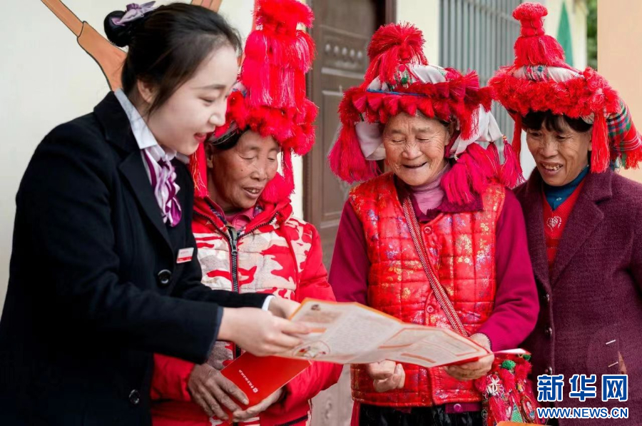 工作人员向老年人宣传金融知识(资料图)。新华网发(云南农信社供图)