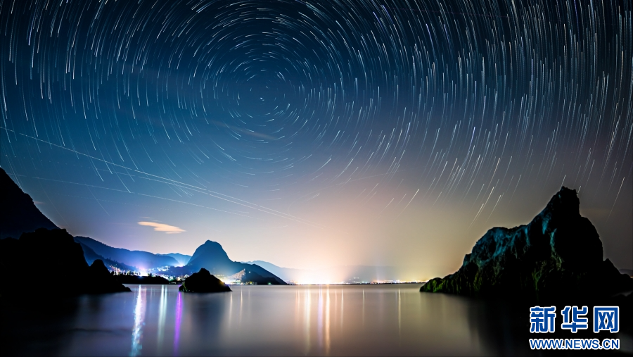 近日,摄影爱好者在云南抚仙湖畔,用延时摄影记录下绝美星空。新华网发(杨洪龙 谢罗凯摄)