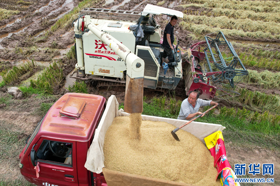9月28日,云南省曲靖市沾益区威格村,农民正在将稻谷装车。新华网发(杨俊鹏 摄)