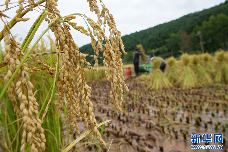9月28日,云南省曲靖市沾益区威格村,农民正在收割水稻。新华网发(杨俊鹏 摄)