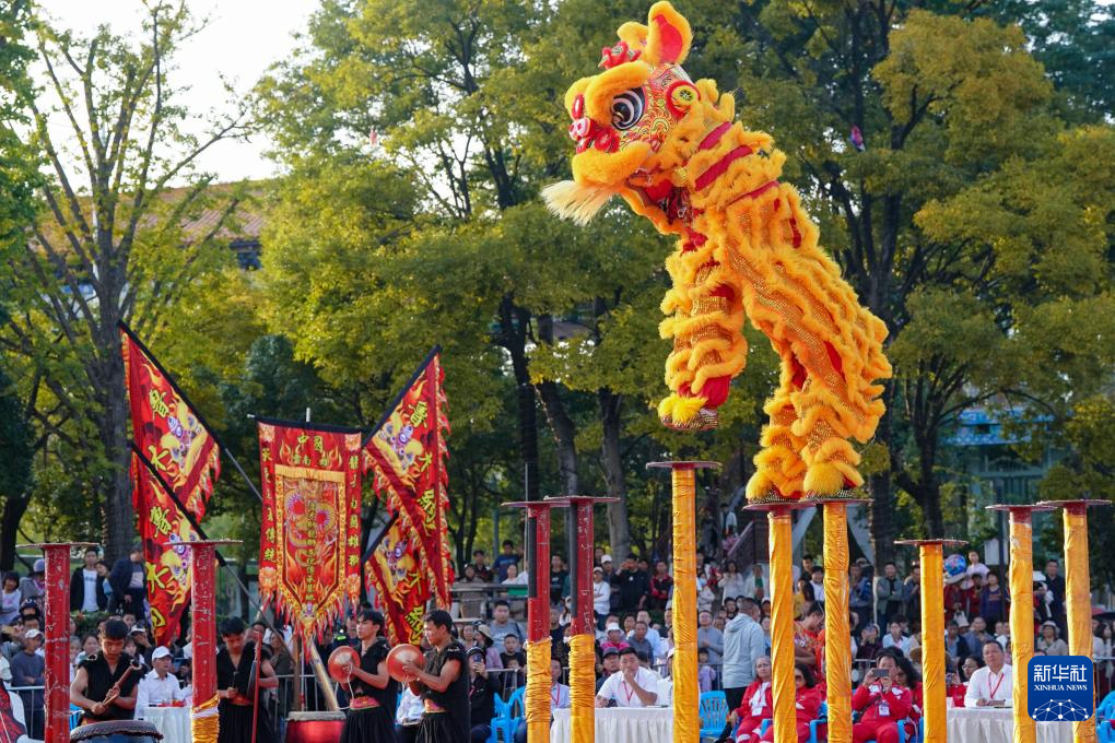 10月19日,云南鲁木纳龙狮艺术团队员在南狮高桩自选套路项目中比赛,最终他们获得该项目铜奖。新华社记者 陈欣波 摄