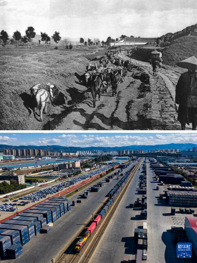 拼板照片:上图为清朝末年,驮运着货物的马帮准备进入昆明城区(资料图片由殷晓俊提供);下图为中老铁路国际货物列车(前)准备从昆明开往老挝万象(无人机照片,2022年1月1日摄)。新华社记者 胡超 摄