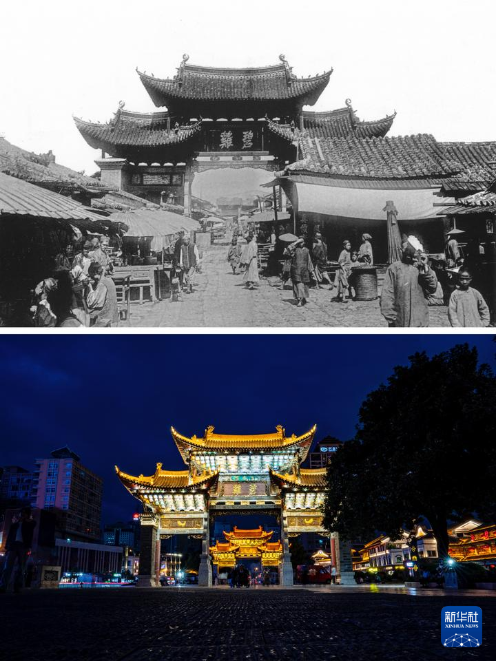 拼板照片:上图为清末时期的昆明碧鸡坊(资料图片由殷晓俊提供);下图为如今昆明市碧鸡坊夜景(2023年6月13日摄)。新华社记者 江文耀 摄