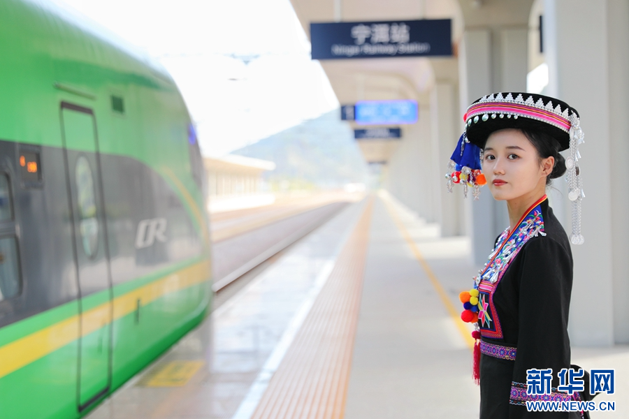 中老铁路宁洱站站台,身着民族服饰的列车工作人员(资料图)。新华网发(杨紫轩 摄)