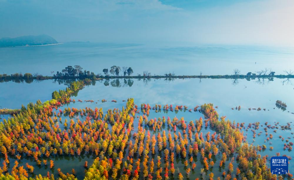 深秋时节,位于云南晋宁的南滇池国家湿地公园,在秋日的朝阳下,连片的水杉林与静谧的湖水相映成趣,似一幅绚丽的水彩画,将秋天的韵律美好呈现。