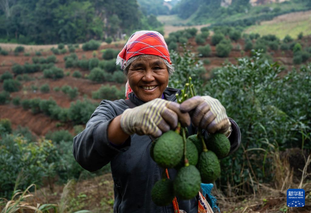 10月29日,一名果农在云南省孟连县一处牛油果种植基地内展示刚采摘的牛油果。