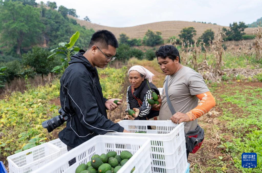 10月29日,孟连县新农人、“牛友果星球”农场创始人李伟(左)在一处牛油果种植基地查看果农刚采摘的牛油果。