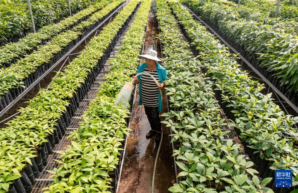 10月28日,一名工作人员在普洱绿银生物股份有限公司位于孟连县的牛油果种苗基地内给牛油果种苗浇水(无人机照片)。