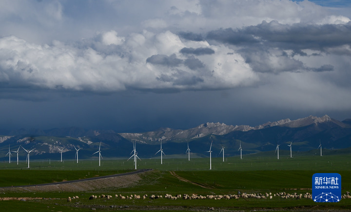 羊群在青海省海西蒙古族藏族自治州天峻草原的一处风电场附近漫步、吃草。新华社记者张龙 摄