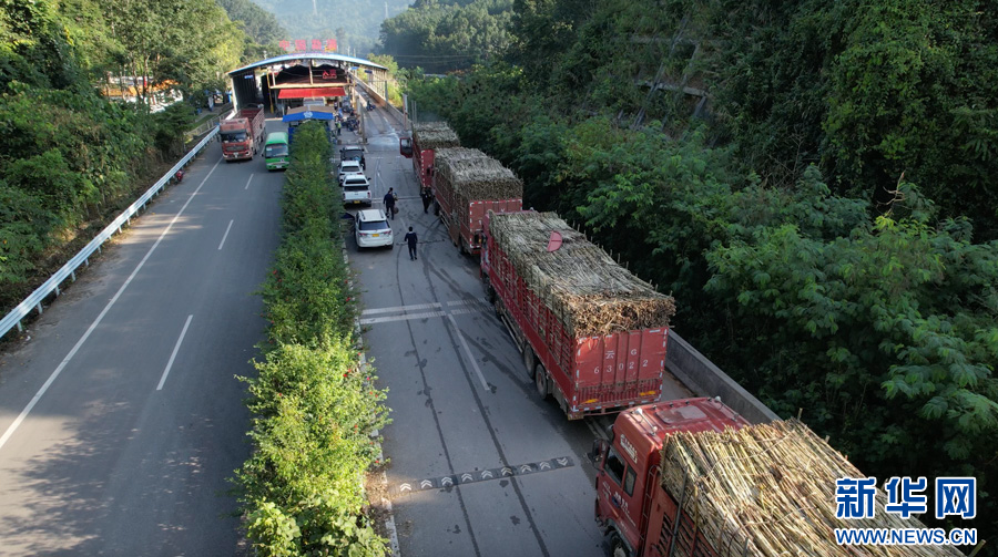 勐满口岸入境甘蔗车辆航拍 (10月29日摄)。新华网发(李扬摄)