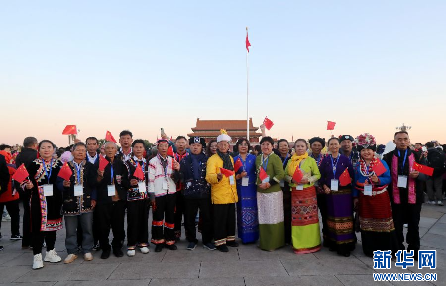 普洱民族团结誓词碑盟誓代表后代们在天安门广场,观礼升国旗仪式。(11月6日摄)。新华网发(普洱市融媒体中心 供图)