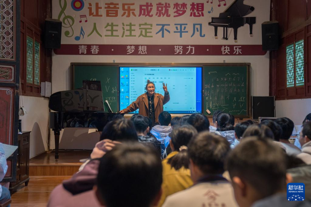 11月12日,在云南省会泽县第一中学,老师在给学生上音乐课。新华社发(彭奕凯 摄)