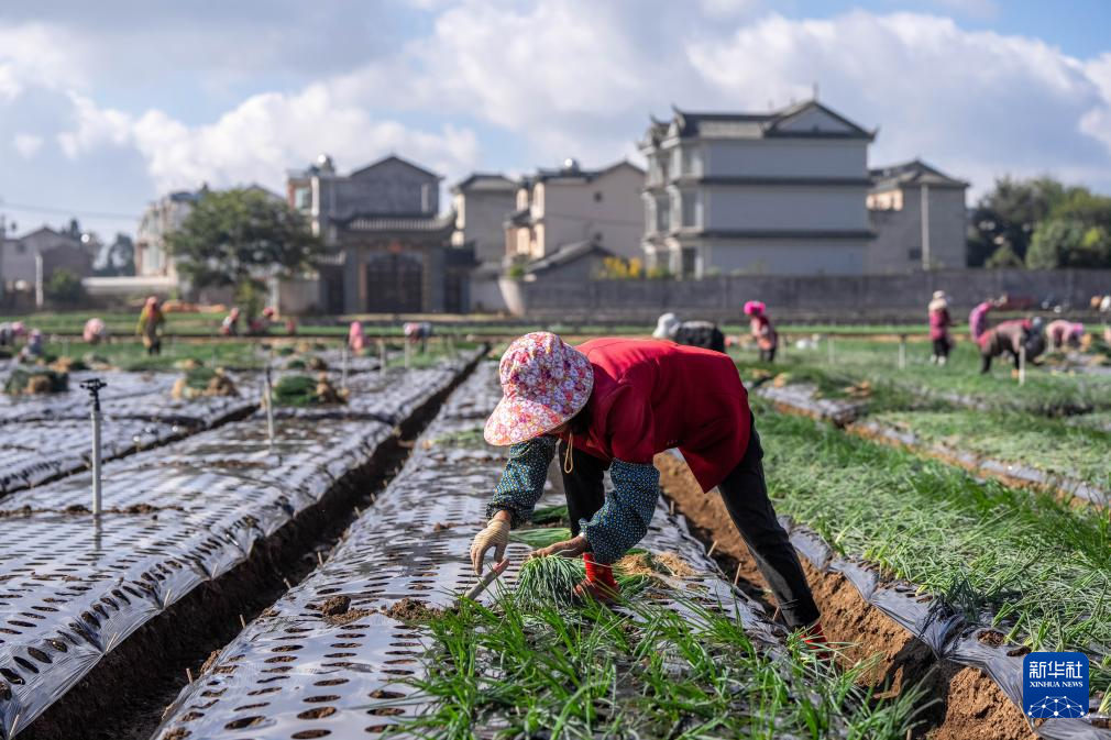 11月13日,菜农在曲靖市麒麟区越州镇现代农业产业园种植小葱。新华社记者 胡超 摄