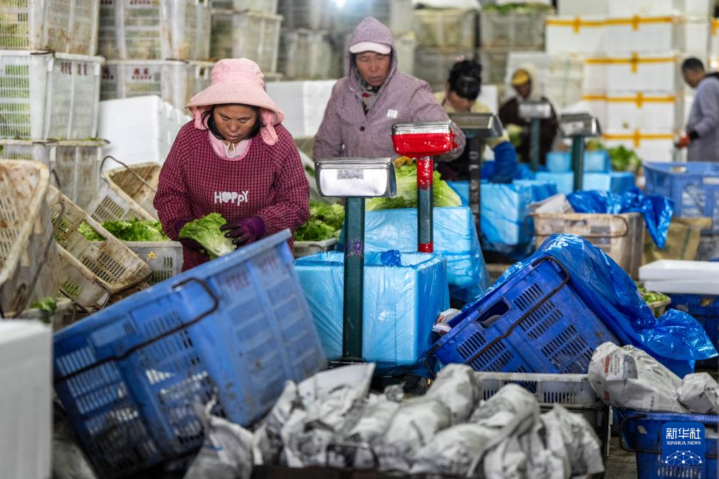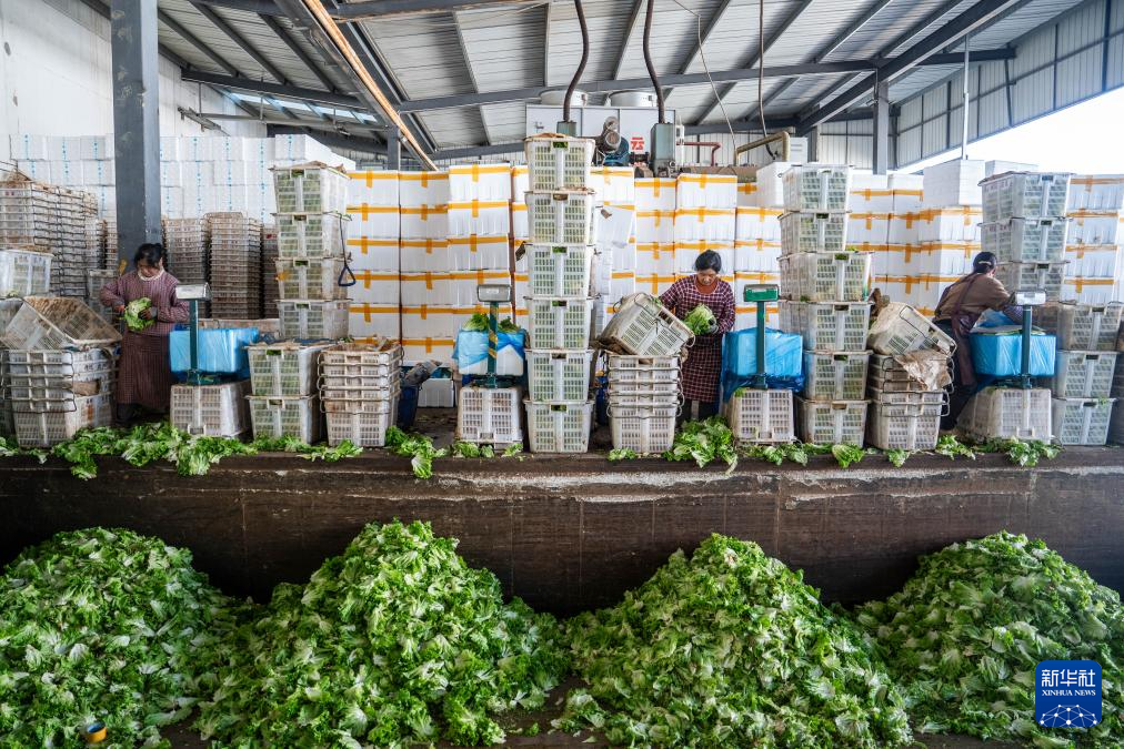11月13日,菜农在曲靖市麒麟区越州镇冷链物流产业园分拣生菜。新华社记者 胡超 摄