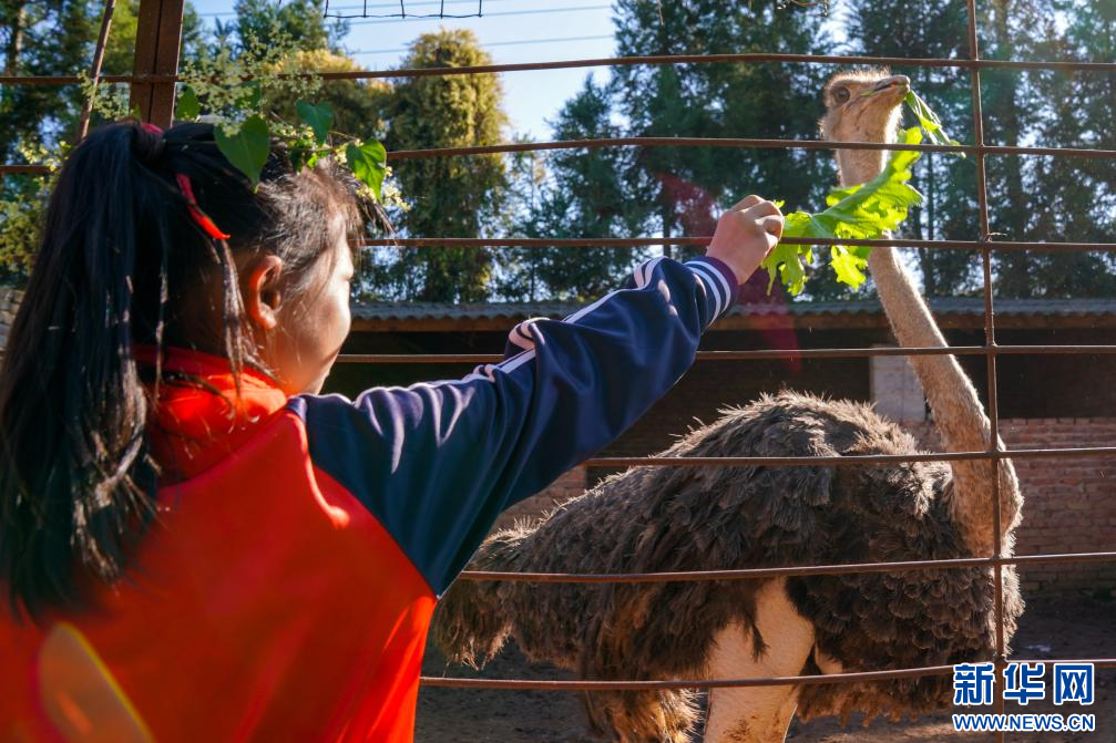 11月15日,靖外明德小学的劳动课上,学生在喂鸵鸟。新华社发(彭奕凯 摄)