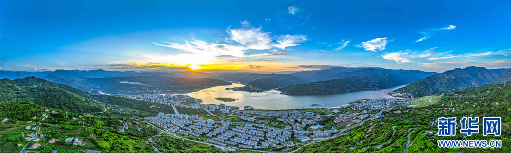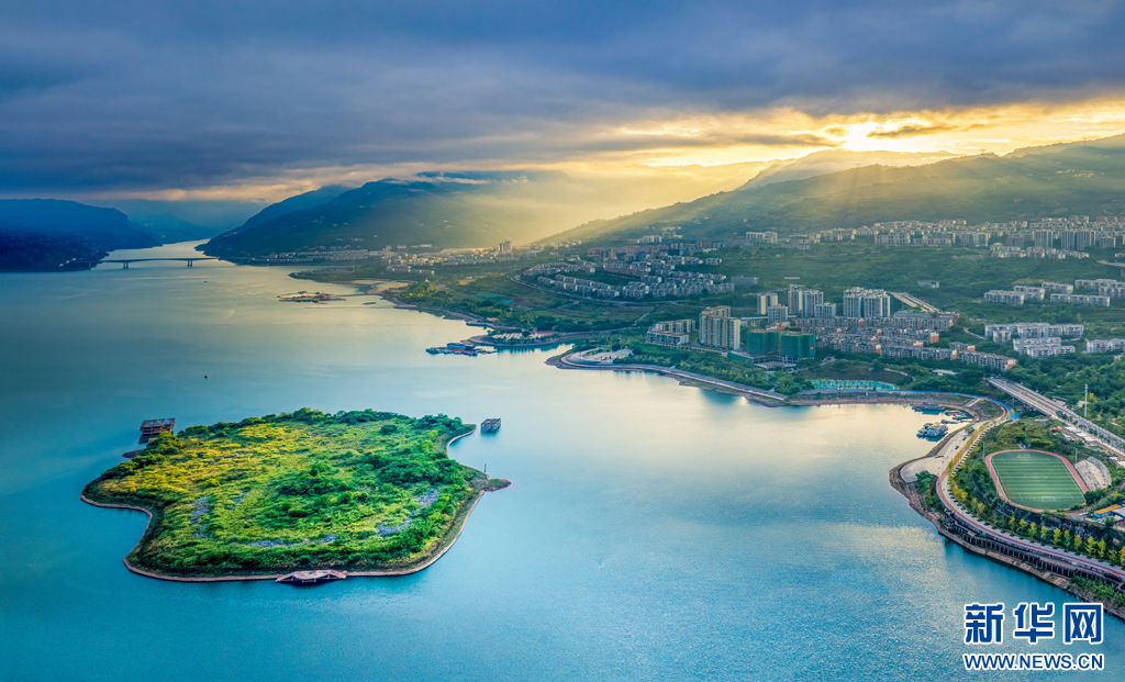 朝阳映衬下的江畔小城绥江,水清岸绿景美(10月23日摄)。新华网发(曾三东 摄)