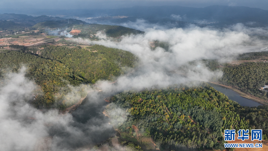 山林、湖水、田地、民居好像披上一层轻纱(11月30日摄)。新华网发(孙文来 摄)