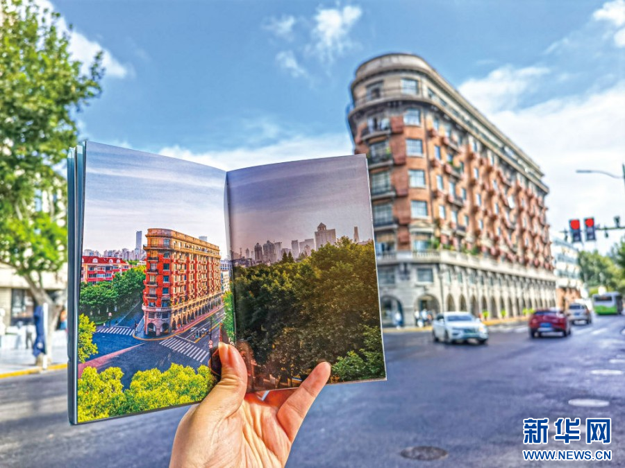 在武康大楼“源点广场”,游客手持“口袋书”与大楼合影(资料图)。新华社记者 陈爱平 摄