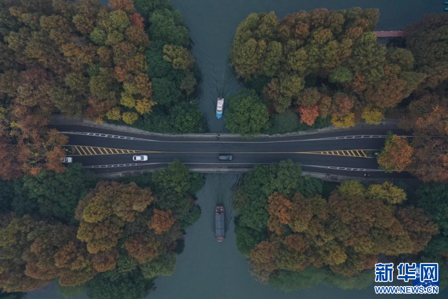 12月3日,汽车行驶在杭州西湖景区的杨公堤,游船从桥下穿过(无人机照片)。新华社记者 黄宗治 摄