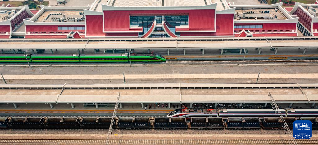 “复兴号”(上)、“澜沧号”动车组列车停靠在中老铁路磨憨站(2023年4月13日摄,无人机照片)。新华社记者 胡超 摄