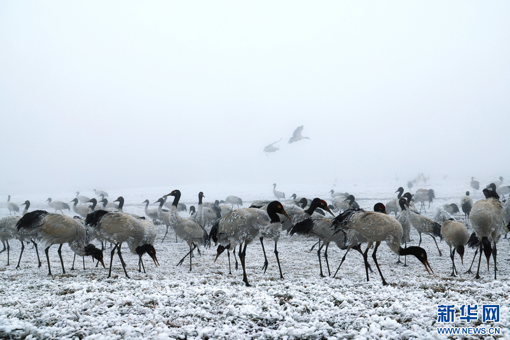冰雾中的黑颈鹤(12月15日摄)。新华网发(郑远见 摄)
