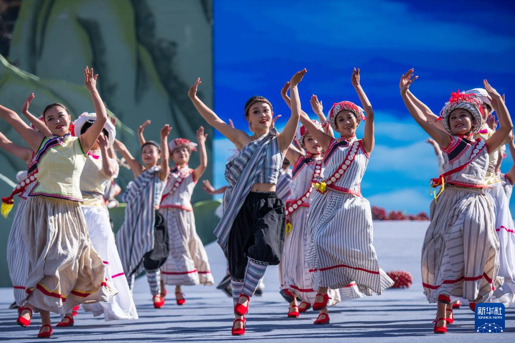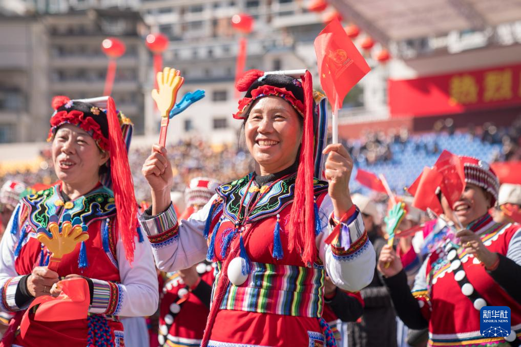 在庆祝大会举办地怒江傈僳族自治州民族体育场内,当地各族群众满怀喜悦,载歌载舞,展示在党的领导下,心手相连、同欢共庆、奋发向上的风貌。