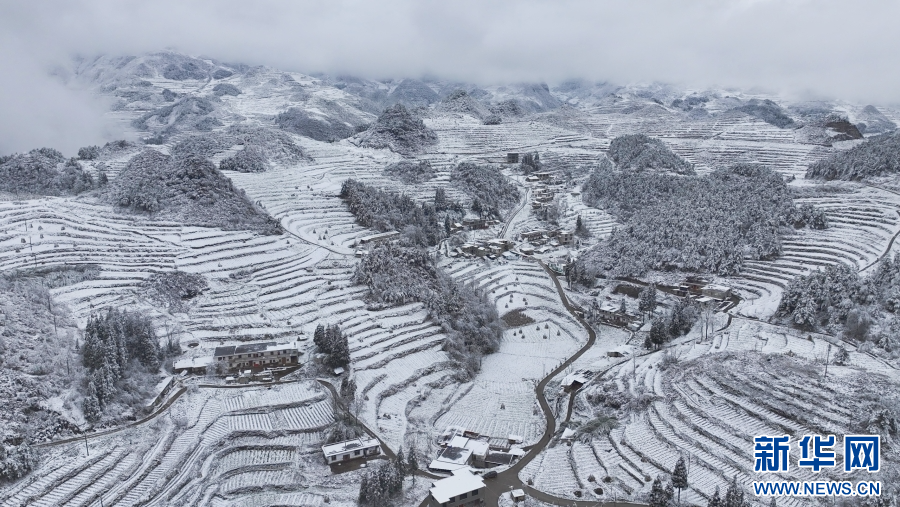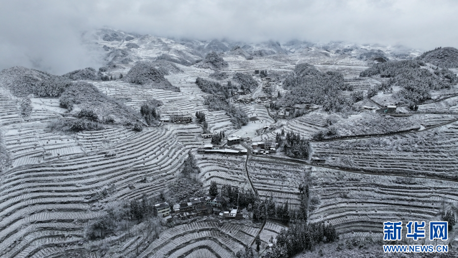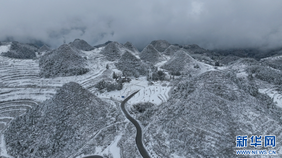 航拍镜头下的雪后小石林。新华网发(视频截图)