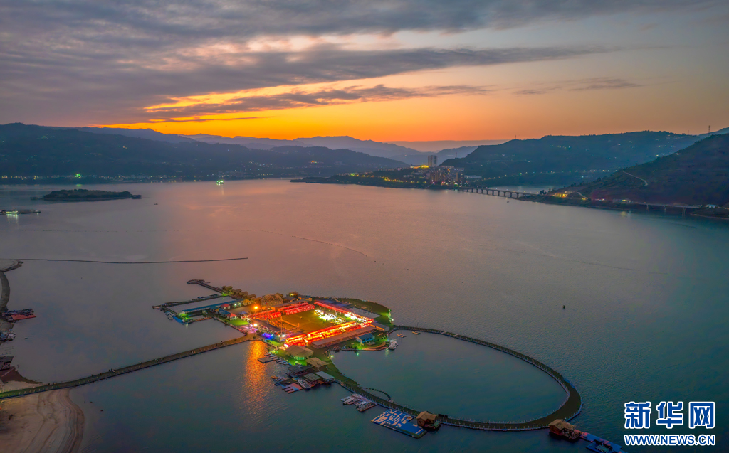 晚霞映照下的绥江水上乐园景区(1月1日摄)。新华网发(曾三东 摄)