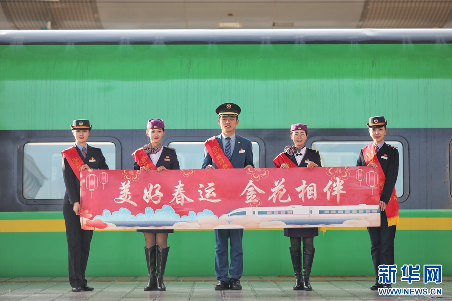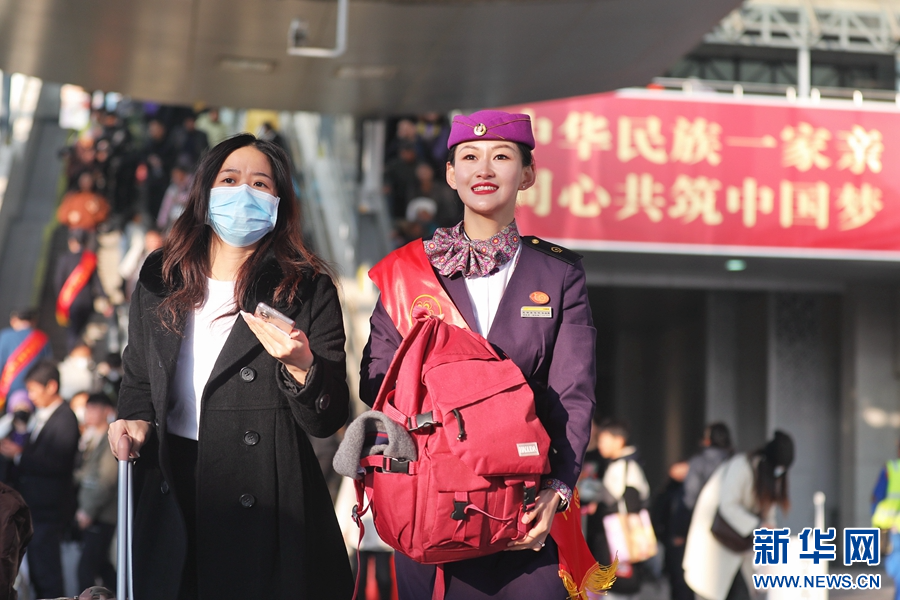 1月14日,国铁昆明局“金花”乘务员微笑服务迎春运。新华网发(杨紫轩 摄)