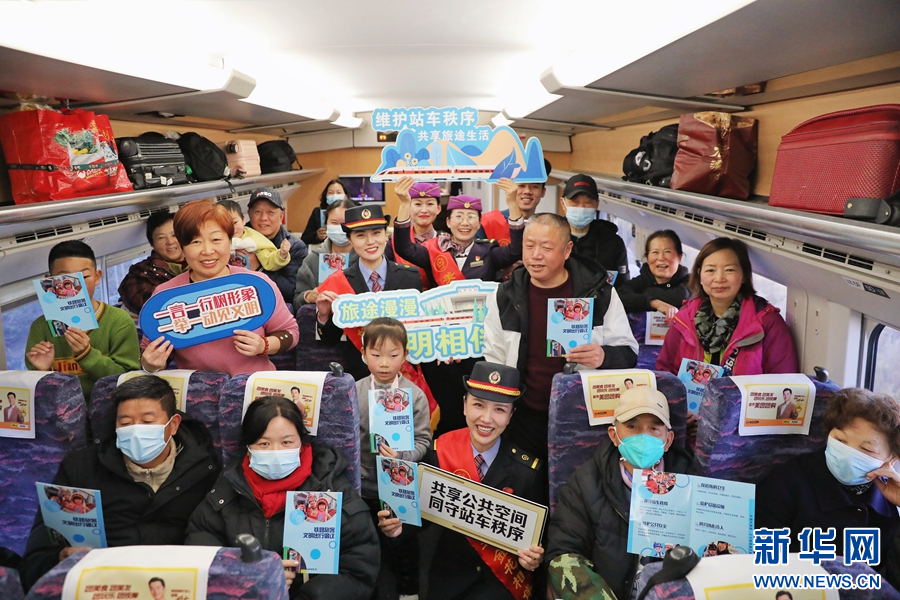 1月14日,国铁昆明局乘务员在列车上开展文明出行宣传活动。新华网发(杨紫轩 摄)