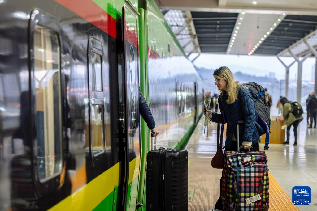 1月14日,一名外国旅客在昆明南站乘坐D87次中老铁路国际旅客列车。新华社记者 胡超 摄