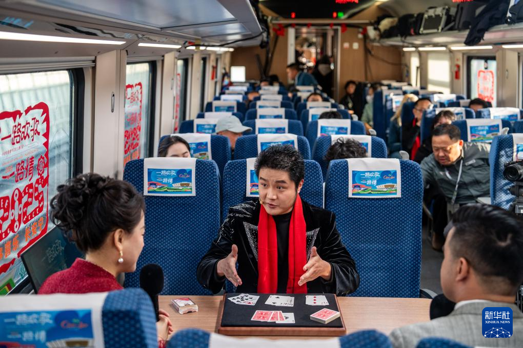 1月14日,魔术师戚原睿(中)在D87次中老铁路国际旅客列车上表演近景魔术。新华社记者 胡超 摄