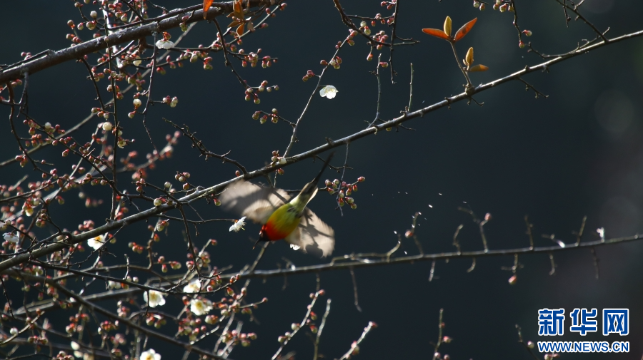 云南腾冲,梅花初绽,鸟儿嬉戏(1月13日摄)。新华网发(赵辉 摄)