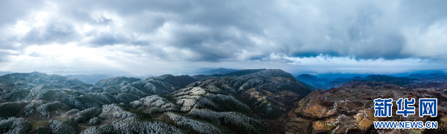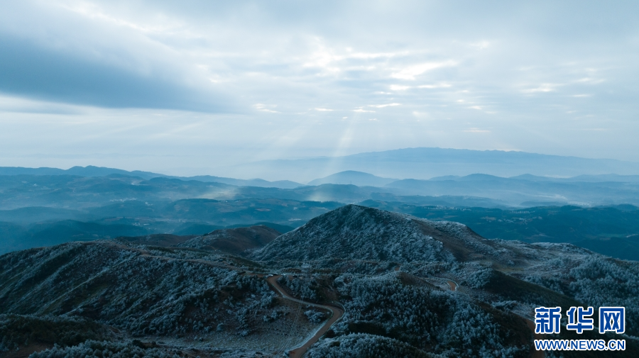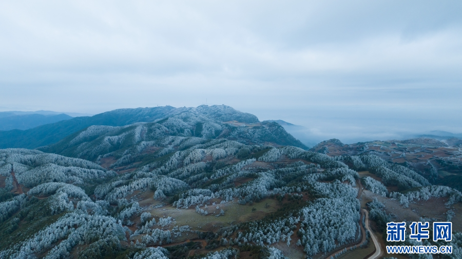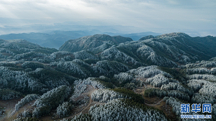 近日,受冷空气影响,云南梁王山迎来雾凇景观。清晨,当第一缕阳光洒在梁王山上,漫山遍野的树木都被雾凇包裹,枝头挂满晶莹剔透的冰花。寒风拂过,慢慢融化的雾凇纷纷扬扬洒落在树林之中。从空中俯瞰,连绵起伏的山林披上银装,十分壮美。新华网发(杨洪龙 曾颖颖 摄)
