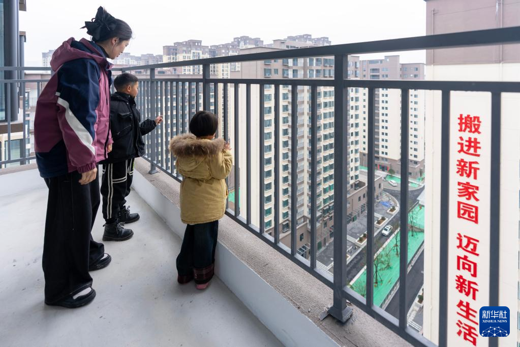 1月16日,村民和孩子在新家阳台上俯看小区。新华社记者 陈欣波 摄