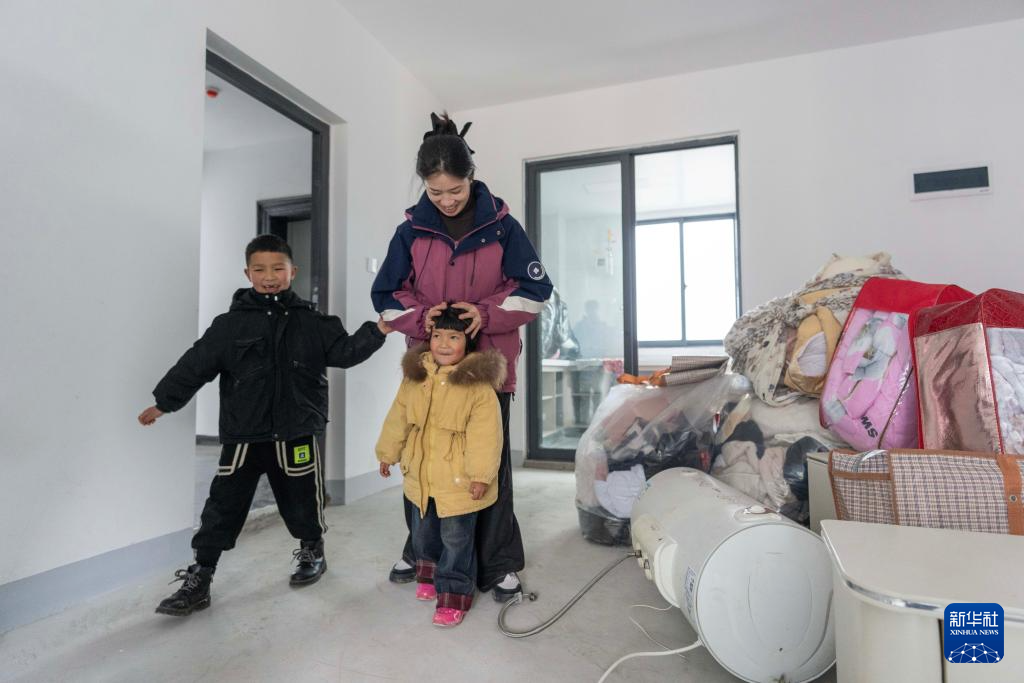 1月16日,受灾村民和孩子在雄俊园小区的新家内。新华社记者 陈欣波 摄