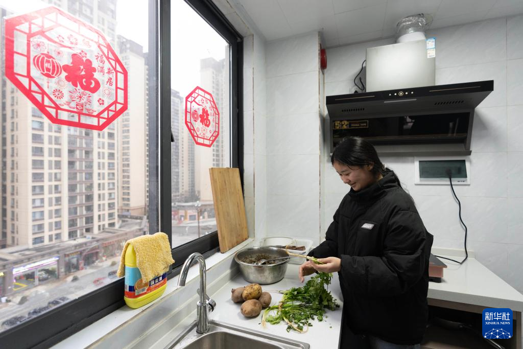 1月16日,一名刚搬入新家的受灾村民在厨房里做饭。新华社记者 陈欣波 摄