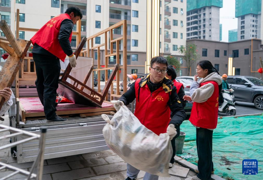 1月16日,志愿者在雄俊园小区帮助受灾村民搬家。新华社记者 陈欣波 摄