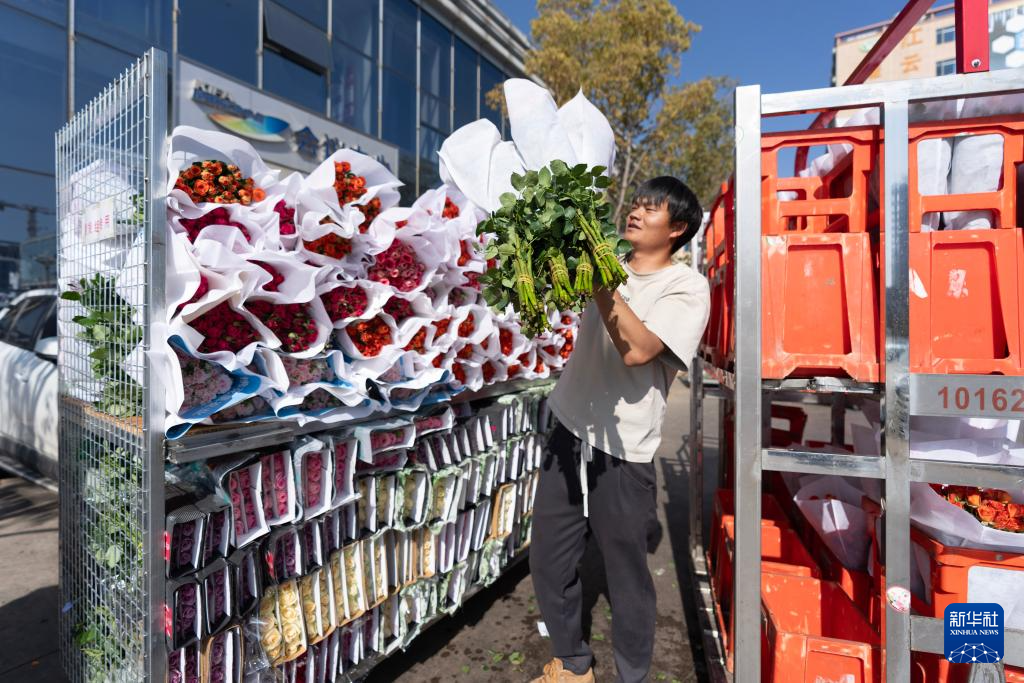 1月22日,工作人员在昆明云舍花卉有限公司打理用于线上销售展示的鲜花。