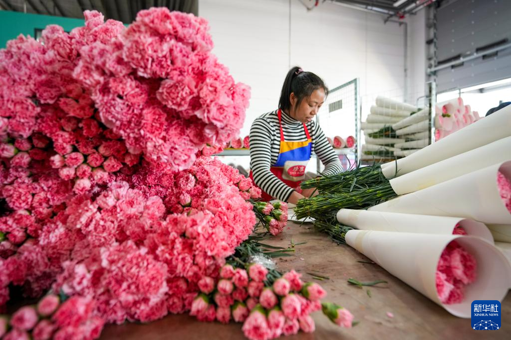 1月22日,一名工作人员在昆明云舍花卉有限公司流水线上摆放鲜花。